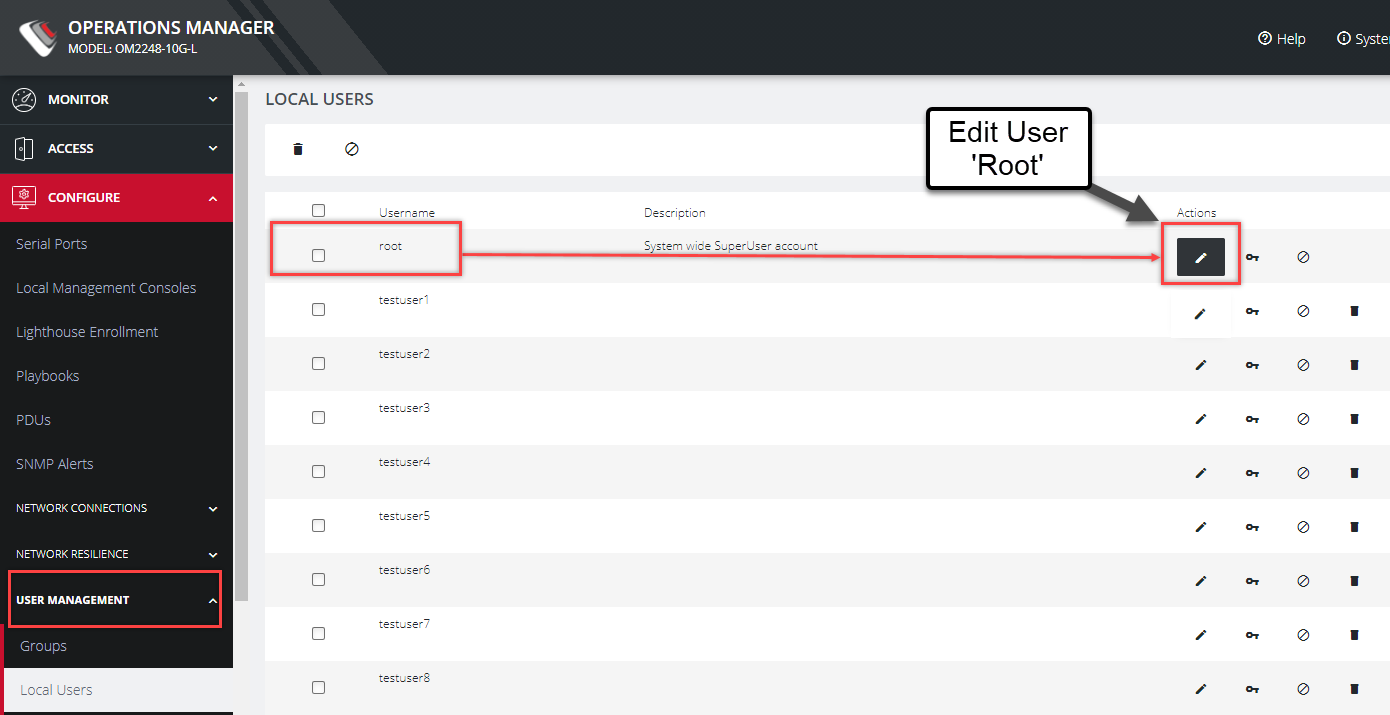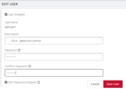 In the Edit User page, if required, enter an optional description in the Description field. Enter a new password in the Password field and re-enter the password in the Confirm Password field.