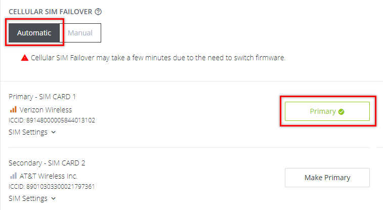 Devices that carry two SIM cards can be configured so that either SIM card slot may be activated. In Automatic failover mode, either of the two SIM cards may be designated as the Primary SIM. (see "Dual SIM" on page 1).
