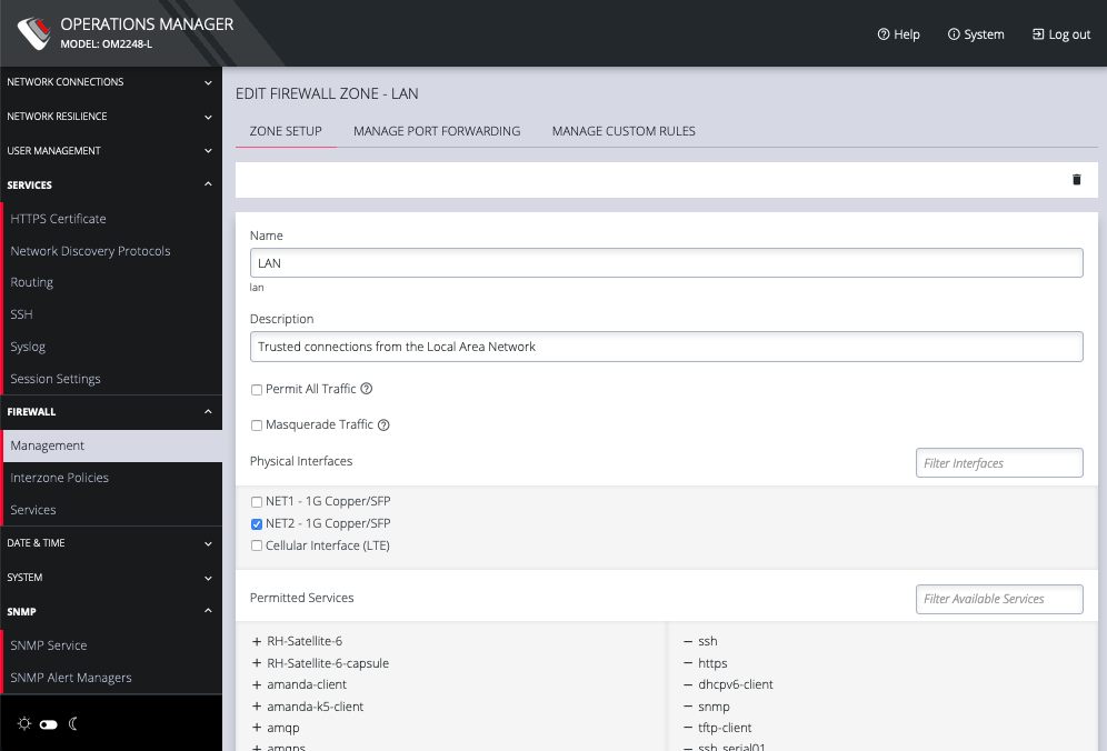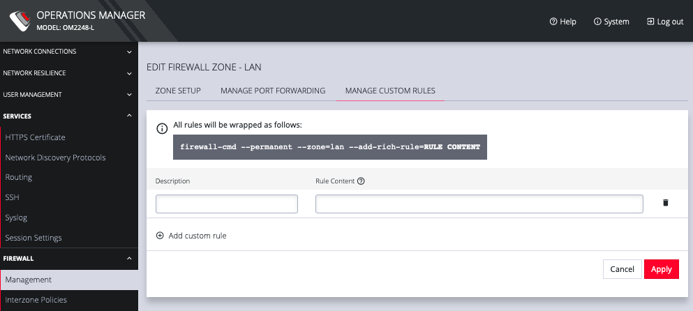 The third tab, MANAGE CUSTOM RULES, allows you to add, edit , and delete custom firewall rules for the zone you are editing. These custom rules continue to exist after reboots, upgrades, and power cycles.