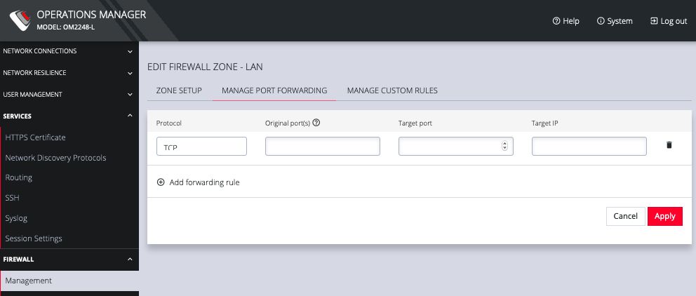 The MANAGE PORT FORWARDING tab allows you to add, edit, and delete forwarding rules for the particular zone you are editing.