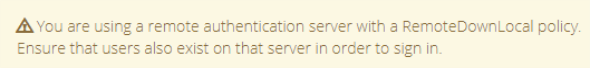 A RemoteLocal alert banner ensures all users are made aware that if the RemoteLocal policy is selected their local users will not be accessible.
