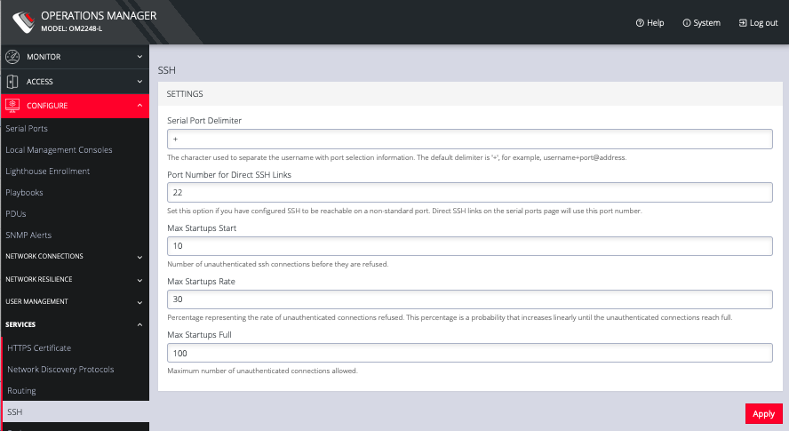 To modify the port used for connecting to serial consoles via SSH, click CONFIGURE > SERVICES > SSH.